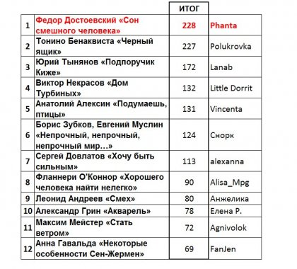 Поздравляю победителя! И второе место достойное, надо же. отрыв в один балл! Но Достоевский того стоит!