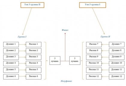 Так и это еще не все - а группы дуэлянтов будут обмениваться рассказами или каждая группа будет читать "свои" рассказы? Если "свои", то сразу будет понятно, где чей рассказ и никакой интриги...