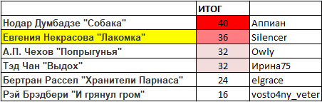 Третье место делят между собой Ирина75 с рассказом Тэда Чана "Выдох" и Owly с рассказом А.П.Чехова "Попрыгунья"!
