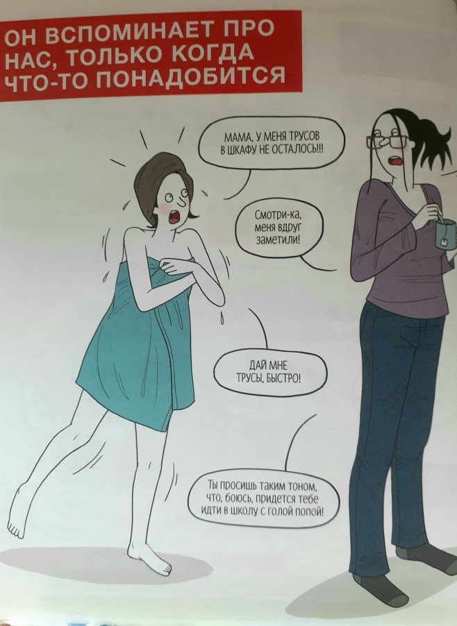 Третья часть предназначена для самих подростков. Ведь не только мы вынуждены жить в квартире с непонятным монстром, но и дети сталкиваются с ситуацией, когда самые любимые люди, мама и папа, вдруг перестают их понимать и отравляют жизнь. Такие же комиксы и схемы теперь уже детям помогают разобраться в поведении родителей.